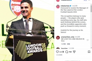 阿尔特塔写道:这份荣誉属于很多人,属于每天全力以赴的球员们,属于幕后辛勤工作的工作人员,也属于每一个时刻都给予我们支持的球迷们。
