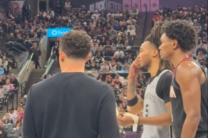 比赛当中,火箭球员阿门死死贴防马刺后卫卡斯尔,对手与主帅米奇沟通时,阿门也在旁边,并且不忘与卡斯尔交流一波。