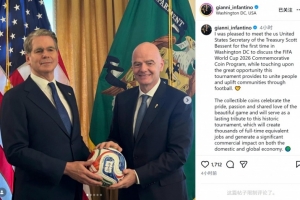 因凡蒂诺社媒写道:“我很高兴在华盛顿特区首次与美国财政部长贝森特会面,共同商讨2026年国际足联世界杯纪念币项目。在此期间,我们也探讨了本届赛事所带来的巨大机遇——通过足球凝聚人心、提振社区发展。