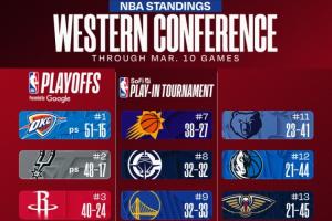 火箭和湖人超越森林狼,后者跌至西部第五。