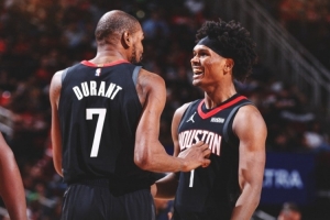 赛后火箭官方发布赢球海报,杜兰特和阿门·汤普森成为封面人物。