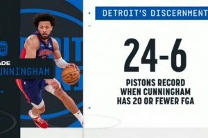 上一场比赛坎宁安26投5中仅得16分,活塞主场103-114不敌马刺