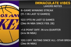 据统计,球队目前保持8连胜(近12场11胜1负),近12战场均轰下122.1分(自2月28日以来联盟第3),第四节净胜分达+1.6(联盟第4),全明星赛后进攻效率高达120.1(联盟第3)。