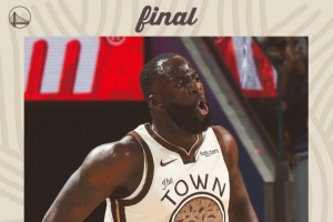 赛后,勇士官方发布赢球海报,封面为追梦怒吼瞬间。