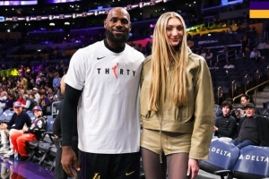 赛前,湖人官方晒出了詹姆斯和卡梅隆·布林克(官方身高195cm)的合影。